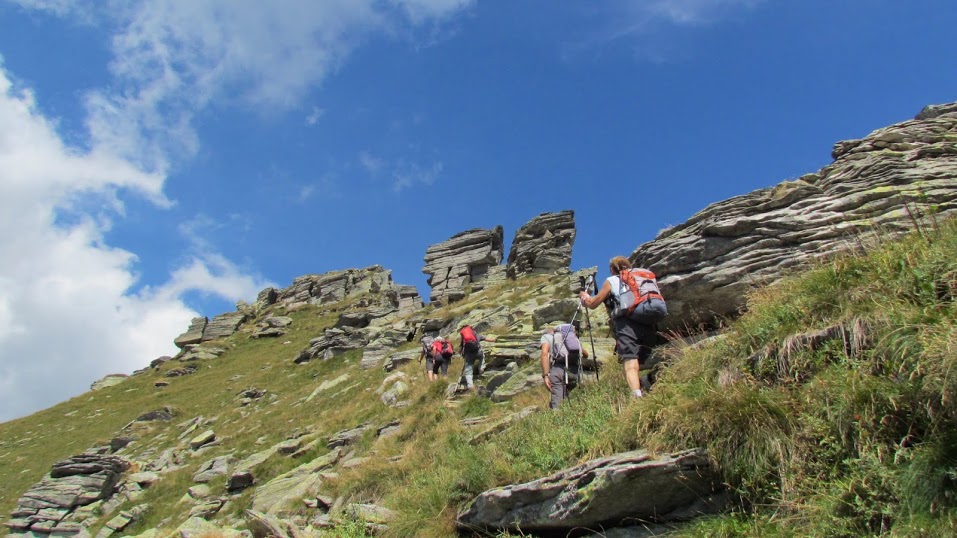 E' presente anche una prestigiosa delegazione walser di Ornavasso.  I cani sono tre. Partiamo dalla zona dell'Alpe Fraccia, sopra Trasquera, a quota 1250. Percorreremo la via più diretta per il Monte Teggiolo, la cresta sud est. Parlare di cresta potrebbe sembrare presuntuoso, ma si tratta, nel nostro piccolo, di un percorso faticoso, sulla ripida dorsale fra Valle Cairasca e Valle Divedro, aereo e divertente nel tratto finale. Dal parcheggio prendiamo il bel sentiero sulla sinistra e, in un’ora e un quarto, raggiungiamo l'Alpe Agro Fuori, 1787.