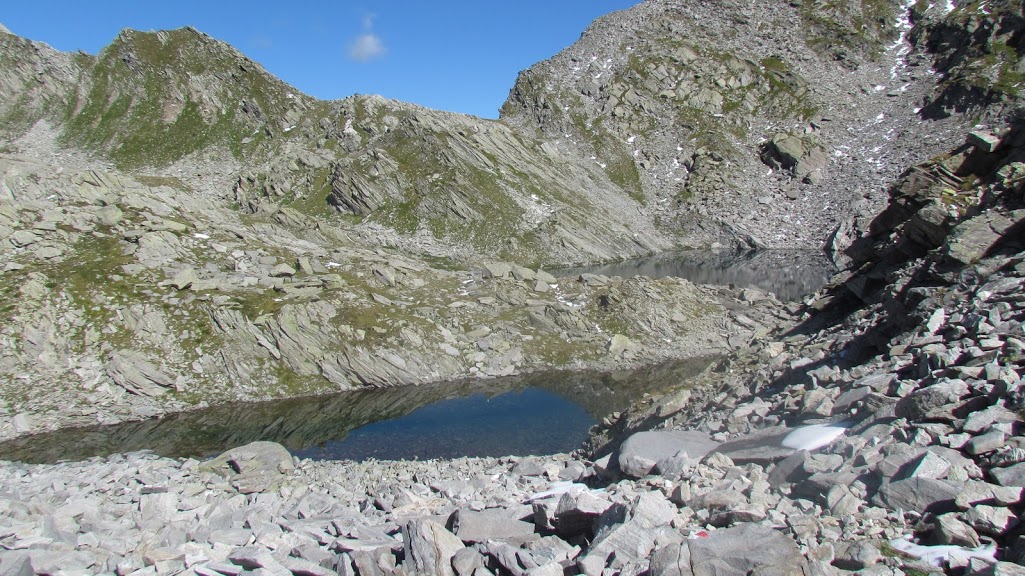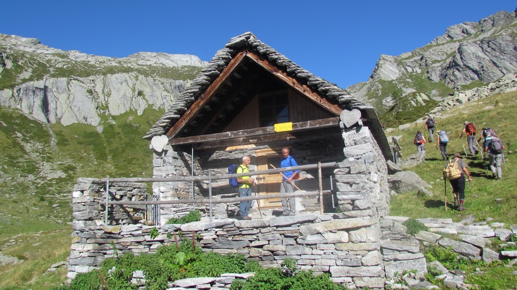 L’impatto di questa strada è piuttosto forte e non sappiamo dove si fermerà: potenza dell’Homo Idroelettricus! Che ne sarà di questo ennesimo ex torrente? Il vecchio sentiero fino a qui è stato cancellato, ovviamente, anche se esiste ancora, malinconicamente, sulle cartine. Al termine della strada c’è un raccordo che permette di imboccare agevolmente la prosecuzione del sentiero L00 (GTA). Nessun cartello indicatore. Su dolci pendenze risaliamo l’Agrasina passando per l’Alpe Cortone, 1481, e l’Alpe Pisardo, 1609, fino all’Alpe Cortevecchio, dove ci fermiamo per la colazione al Rifugio Bonasson,1925, chiuso (circa due ore). Dopo la pausa s’inizia a salire seriamente. In breve siamo all’Alpe Cavegna ed al ricovero omonimo, 2040, aperto e molto accogliente. Quindi, volendo, ce la possiamo fare anche in patria. Potenza dell’iniziativa privata! Più avanti il pendio si fa molto ripido, prevalentemente su pietraie, ed il sentiero non è sempre evidente, tranne nel tratto finale che ci porta faticosamente alla Bocchetta del Lago Gelato, 2434 (un’ora e mezza). In questo angolo di paradiso ci sono due bellissimi laghetti ed un panorama stupendo sulla Valle Isorno e dal Rosa ai quattromila di Saas Fee e del Sempione.