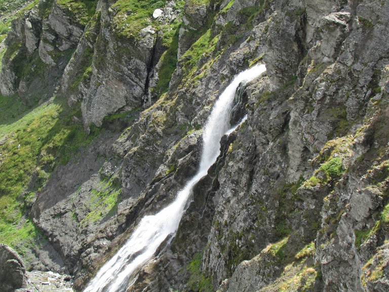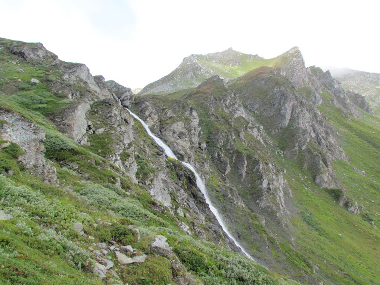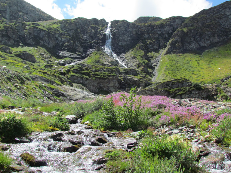 cendiamo ad attraversare il torrente e passiamo sulla sponda destra. Risaliamo alle baite di Chlusmatte e proseguiamo la morbida salita lungo il sentiero evidente e ben segnato, in mezzo al verde di rododendri e piccoli larici. Il passo tranquillo che devo tenere per sostituire degnamente la guida titolare mi dà tempo di pensare che qui, in inverno, con sci, zaino più pesante e neve spesso gelata, il pendio sembra molto più ripido. Raggiungiamo il primo ampio pianoro e ci troviamo di fronte la bellissima cascata che nasce dai laghi di Sirwolte. Lo strappo successivo, con l’aiuto ad un certo punto di alcuni gradini di ferro, conduce al disopra della cascata. Camminiamo da quasi un’ora e mezza.