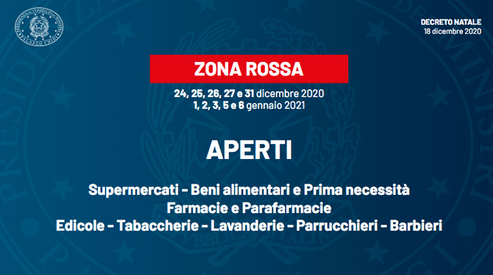 In particolare il 24, 25, 26, 27 e 31 dicembre 1, 2, 3, 5, 6 gennaio saranno giornate rosse per tutto il Paese, dove si potrà uscire di casa solo per ragioni di lavoro, necessità e salute.