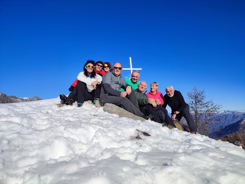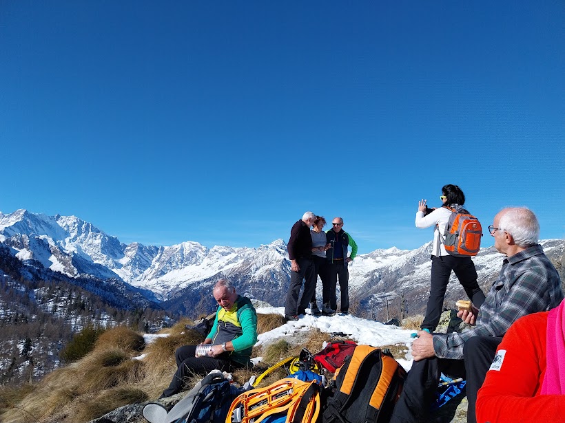 Pochissima neve e condizioni quasi estive. C’è una piccola croce di ferro ed un panorama incredibile dominato dalla Est del Rosa. Nessuna traccia del “forte favonio”, temperatura primaverile e pranziamo con calma qui in Paradiso. Ripartiamo malvolentieri diretti a nord est calzando per un breve tratto le ciaspole, almeno chi le ha. Un po’ di neve c’è su questo versante nord non ancora raggiunto dal sole.