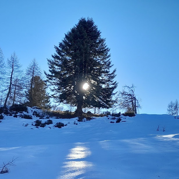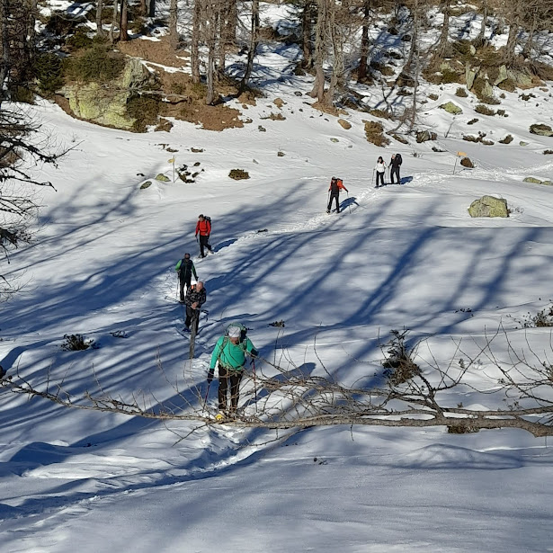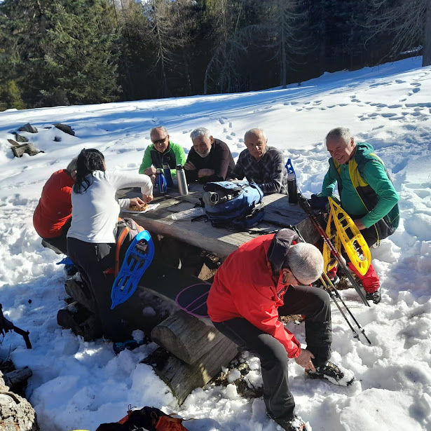 Parliamo adesso di ciaspole! I due più saggi (e fortunati) le lasciano in auto, mentre gli altri sei le hanno con sé. Solo io e un amico, però, le calziamo. L’innevamento è molto scarso e irregolare grazie al vento e alle temperature anomale. Quindi, o si allunga il percorso per seguire la neve, che, oltre al resto, è anche pesante e raddoppia la fatica, o si continua a mettere e togliere le ciaspole. E’ così che arriveremo più tardi alla sofferta decisione di riporle anche noi nello zaino, mentre gli altri sei ci aspettano pazienti, in un silenzio che vale più di mille parole.