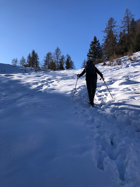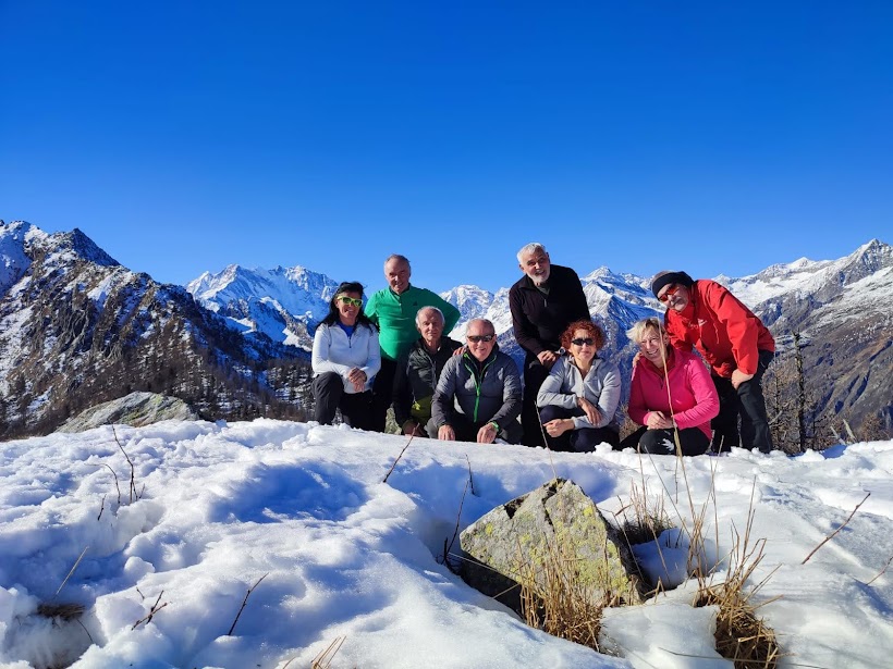 Dopo poco meno di un’ora e un quarto di cammino, a dir poco irregolare a causa del mio dubbio amletico “ciaspole o non ciaspole”, siamo all’Alpe Loro, 1333. Pausa colazione.  Si prosegue per l’Alpe Rausa di Bannio, 1367, l’Alpe Rausa di San Carlo, 1486, e l’Alpe Ielbi. Le pendenze si fanno sempre più dolci ed arriviamo a Villa Samonini, 1638. A questo angolo di paradiso sono particolarmente legato perché proprio qui, nell’estate 2020 ed in piena pandemia, pranzando su un bellissimo tavolo di legno, nacque il gruppo dei Murmäta, amici prima ed escursionisti poi. Breve pausa e raggiungiamo la bella conca di Campo Aostano, 1780.