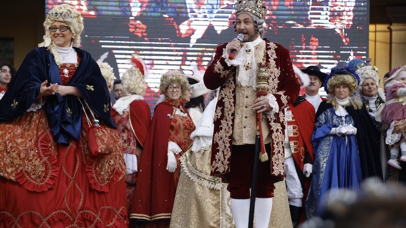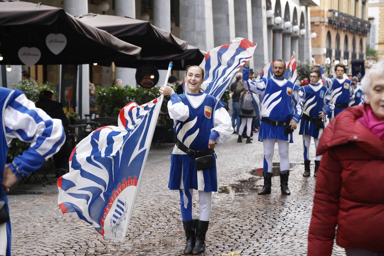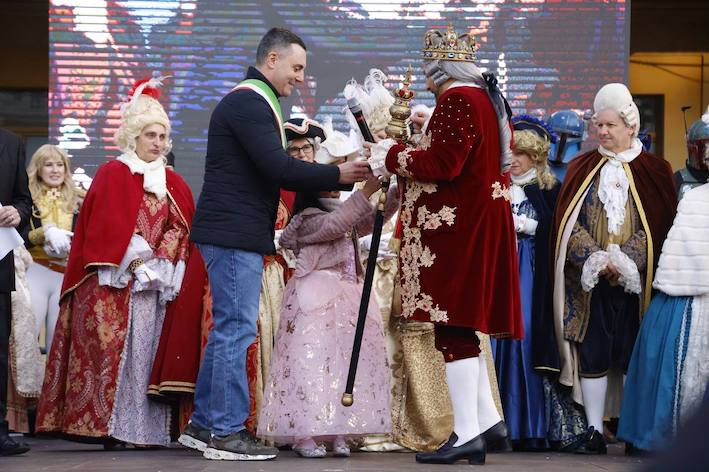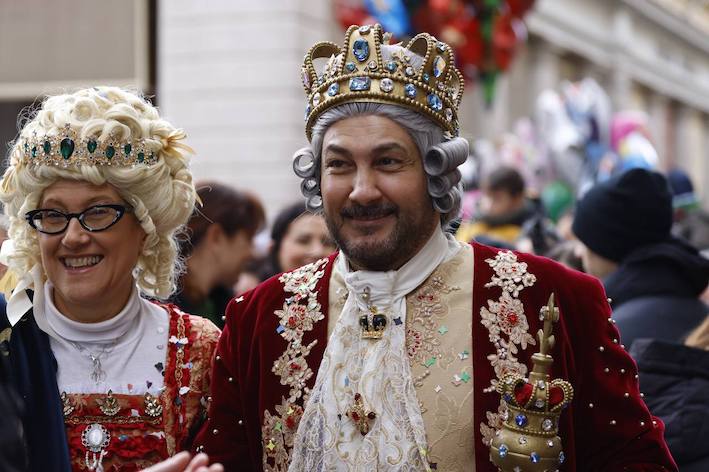 Il lungo corteo mascherato si è aperto con in testa i "reali" novaresi, Re Biscottino e la Regina Cunetta.