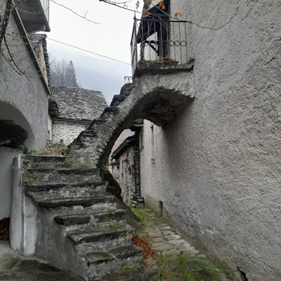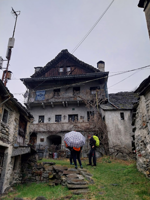 Parcheggiamo nella piazza della chiesa di Varzo, 550, e, dopo il caffè e il giro guidato per il centro storico, ci avviamo lungo la strada asfaltata che sale verso nord. Avvisiamo Marina che saremo in sei a pranzo, mentre inizia a cadere una pioggia leggera che ci accompagnerà per tutto il giorno, sotto forma di neve sopra quota 1300. Dopo pochi minuti imbocchiamo la mulattiera/sentiero F06 sulla destra, contrassegnata anche da cartelli in legno, che seguiremo facilmente fino alla meta. Più avanti, sempre con gli ombrelli aperti,  attraversiamo le case di Durogna, 695, e raggiungiamo l'oratorio. Di qui parte il “Sentiero dei Tassi” che attraversa due volte la strada asfaltata per Dreuza e ci porta a Casa Gatti, 785.