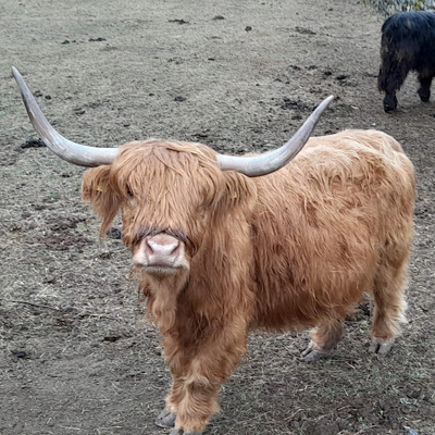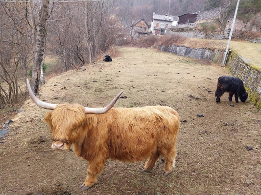 Dopo quasi un'ora di cammino attraversiamo ancora una volta la strada e siamo a Dreuza, 980. Qui comincia a faticare un anziano che non è in giornata e inizieranno frequenti seppur brevi pause, per consentirgli di rifiatare, che ci porteranno al rifugio all'ora di pranzo e non all'ora dell'aperitivo, com'era nostra abitudine. In un ampio recinto si gode tranquillamente il clima, simile a quello della sua Scozia, una famigliola di bovini Highlander. Nel racconto di una gita all'Alpe Asinello del 2021 avevo erroneamente confuso questi bovini europei con gli yak tibetani.