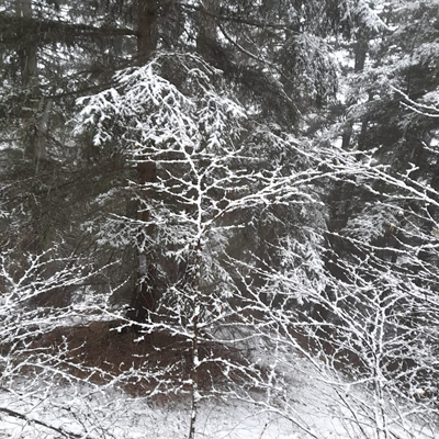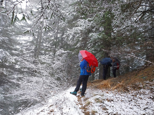 Ma siamo buoni cristiani... più o meno.  A quota 1135 (Alvazz ?), nei pressi di una casa che offre un buon riparo, facciamo colazione. A Baratta, 1240, incontriamo il bivio per il Passo della Colmine, a destra. Noi teniamo la sinistra verso Solcio. La pioggia leggera si trasforma in una fine nevicata a quota 1300 e, poco più in alto, entriamo nel bel bosco di faggi e abeti.