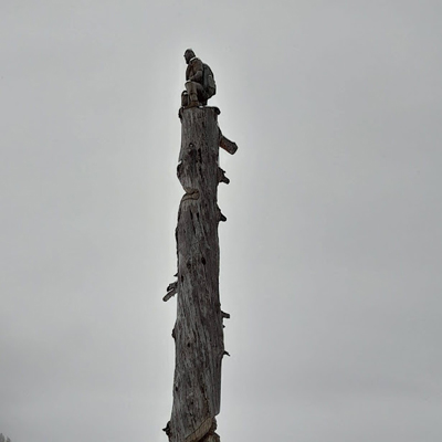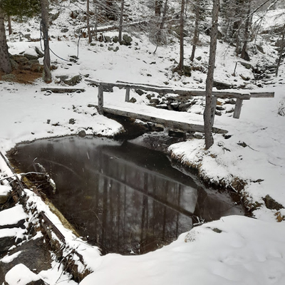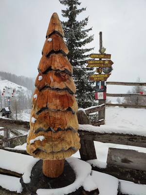 Attraversiamo un ponticello di legno sul Rio Sangioanni, ora ruscello, che scende dal Vallone di Solcio ed incontriamo la strada che sale da Maulone. La seguiamo per pochi minuti camminando finalmente su qualche centimetro di neve e siamo al Rifugio Crosta. Da Dreuza due ore e un quarto, escluse le soste, con passo da “vaca vegia”, come dice agli altri, non oggi, l'anziano affaticato. Appena prima del rifugio c'è una bellissima scultura lignea monoblocco su un tronco d'albero, di Mario Storno (2015).