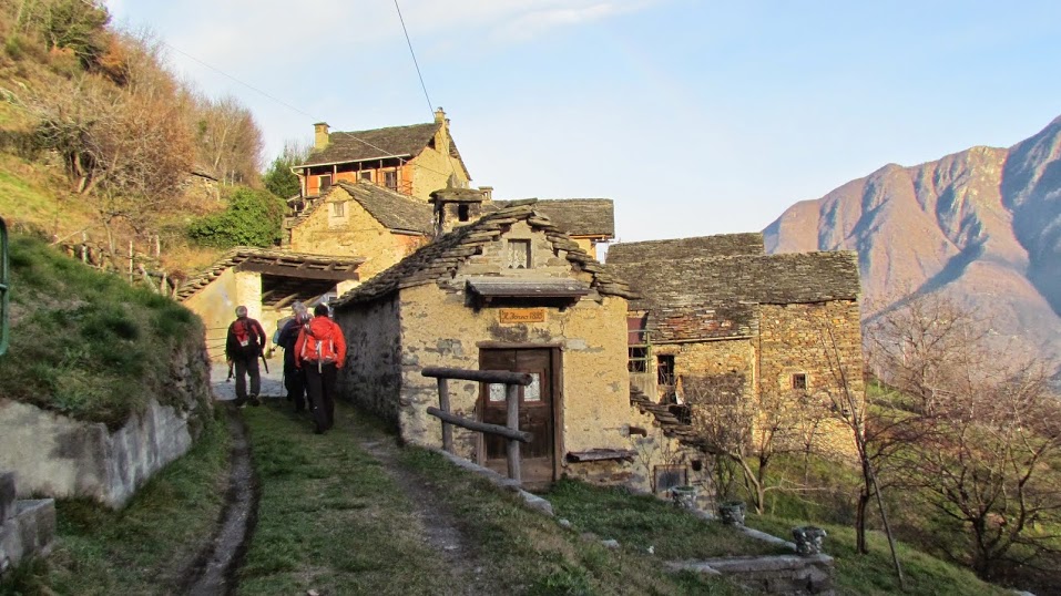 Sui meravigliosi antichi borghi di Anzuno, Tappia e Sogno ci sarebbero da scrivere libri. Siamo in anticipo. In sette facciamo una puntata fino a Varchignoli, 584, con il suo itinerario archeologico, mentre gli altri cinque organizzano aperitivo e pranzo sui comodi tavoli di Sogno (quasi un'ora andata e ritorno). Mentre ci sfamiamo abbiamo la gradita sorpresa di un amico salito in auto da Villadossola per salutarci. In un'ora siamo di nuovo a Tappia e ci fermiamo a dissetarci nell'agriturismo di recente apertura.