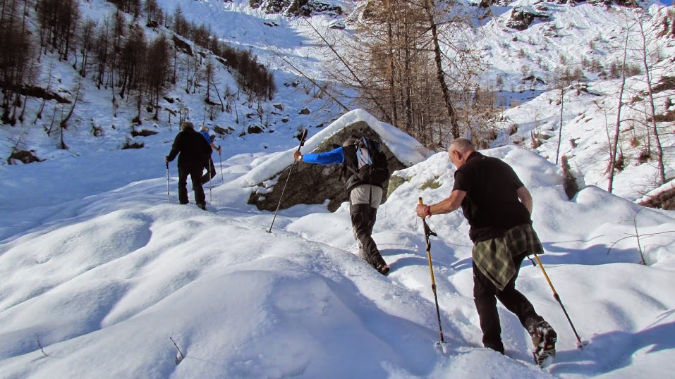 Nasce, quindi, l'eroica decisione di salire ancora, lasciando di guardia tre amanti del calore della baita e del rischioso aperitivo. Alle spalle delle baite di Motto, in direzione ovest, sale un ripido sentiero e, dopo pochi minuti, a quota 1750, troviamo la neve. Le ciaspole sono rimaste a valle e quasi subito ci troviamo a batter pista in sessanta centimetri di bianco mantello. Due “tifosi” dell'estate rinunciano, mentre in cinque coraggiosi, faticando più del previsto, raggiungiamo l'Alpe Tanzonia, 1912, in tre quarti d'ora da Motto.