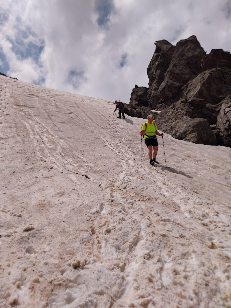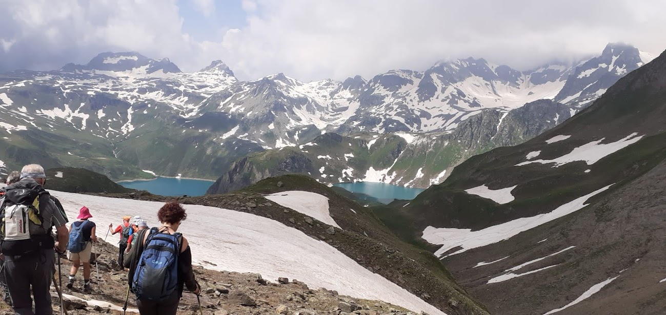 FORMAZZA- 11-07-2024-- Questa bellissima escursione ad anello “aperto” ce l’eravamo già gustata altre volte, ma oggi, senza averla programmata, la percorriamo per la prima volta in senso antiorario, onorati di essere guidati dal nostro presidente walser. C’è ancora tanta neve che ci rende più gradevoli sia la salita al Passo di Nefelgiù, sia la discesa dalla Bocchetta del Gallo.
