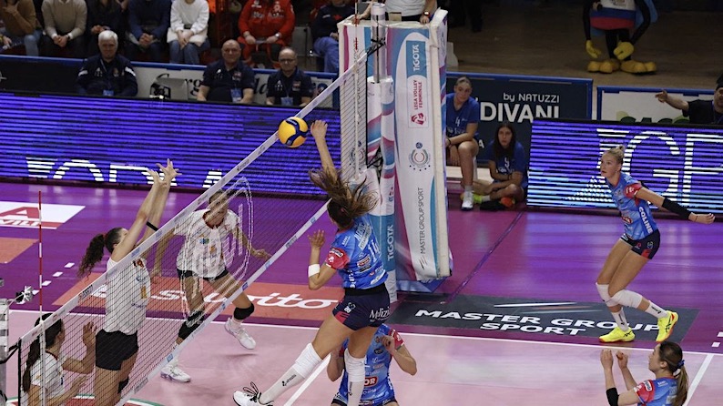Orvosova riparte forte (3-5, diagonale vincente), Bosio mura Rotar (5-5) e Squarcini scappa 7-5 mentre Cuccarini ferma il gioco. Roma ricuce due volte (7-7, poi 9-9) e tre ace in fila di Mirkovic lanciano le ospiti sul 9-12, mentre Bernardi chiama a raccolta le sue; Tolok ne fa due in fila per il sorpasso (13-12) sfruttando la battuta di Bosio e le difese di De Nardi, la solita Ishikawa firma il break del 18-14 e nel finale sono protagoniste Bartolucci e Mims, con l’americana che inchioda il 20-17 e poi il +4 successivo (21-17). A far scorrere i titoli di coda è un gran muro di Aleksic, sul 25-18.