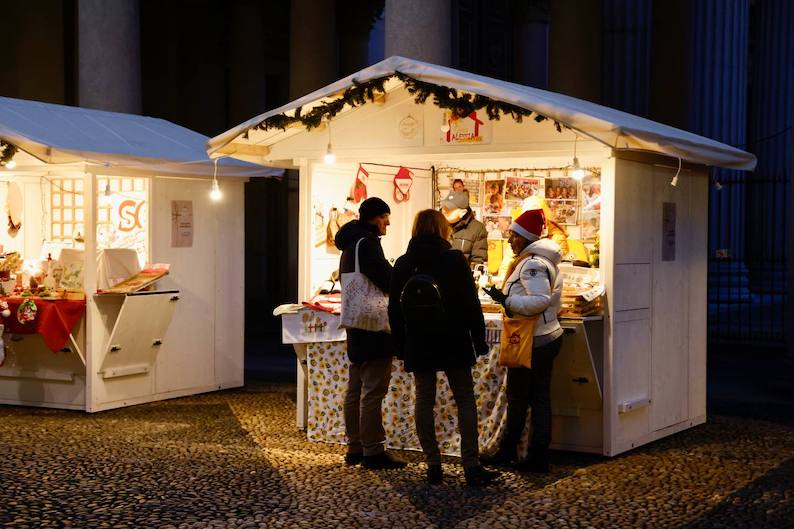 12 casette in legno allestite in tema natalizio con 47 realtà del Terzo Settore