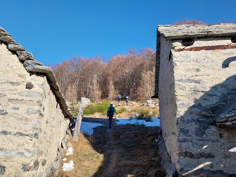 Ai faggi si sostituiscono gradualmente i larici e poi i prati in mezzo ai quali, “traversando” verso destra (oriente), arriviamo all'Alpe Campo, 1852 in tre quarti d’ora. C’è un po’ di neve qua e là, a seconda dell’esposizione del pendio. C’è più sole che a Spino e l’acqua della fontana scorre libera, come fosse già primavera.