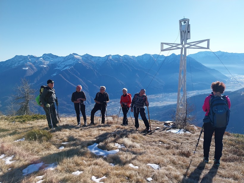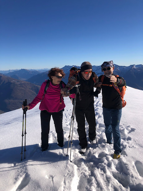 Io, ben in coda al gruppo, attingo alle penultime riserve di energia e vengo, scherzosamente ma non troppo, sorretto dalla capo-badante e dal Direttore Tecnico negli ultimi metri pianeggianti. Breve meritato riposo mentre non si sa più cosa fotografare tanto il panorama è straordinario. Una coraggiosa ribellione alle idee prudenti della Direzione ci consente di scendere direttamente all’Alpe Campo con percorso diretto lungo una traccia ben contrassegnata da ometti, evitando di passare nuovamente dalla croce.