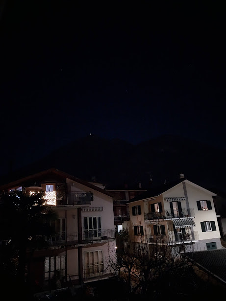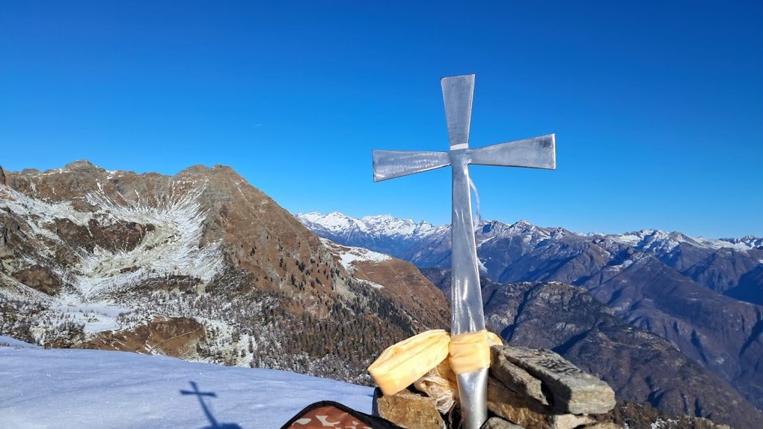 Si decide, non all’unanimità, di non salire direttamente in vetta, ma di allungare il percorso, proseguendo verso oriente, per passare dalla grande croce, illuminata di notte, sulla dorsale fra Pizzo Crogna (altra croce non illuminata) e Cima Lariè. In breve, pestando un po’ di neve e passando dai prati ad un rado bosco di larici, siamo alla croce, quota 1900 circa.