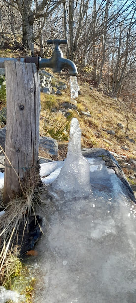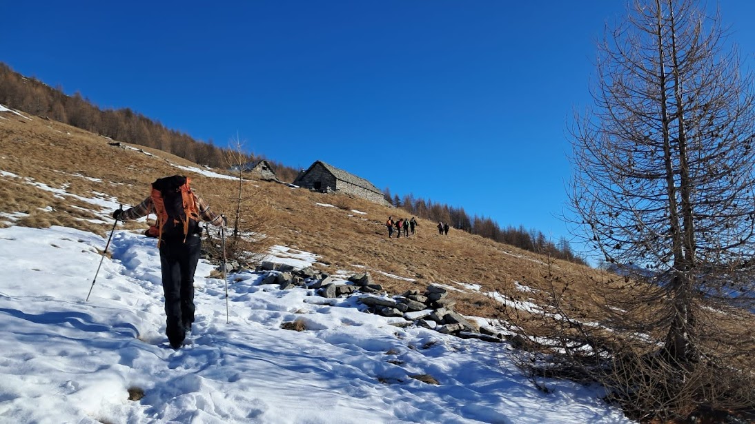 Sempre lungo il sentiero D04, evidente e ben segnato, si raggiunge l'Alpe Spino, 1550, con attenzione, che sarà raddoppiata in discesa, alle foglie in cui affondiamo quasi fino alle ginocchia (mezz’ora). Breve pausa e, fra le due baite dopo la fontana completamente gelata, si riprende a salire.
