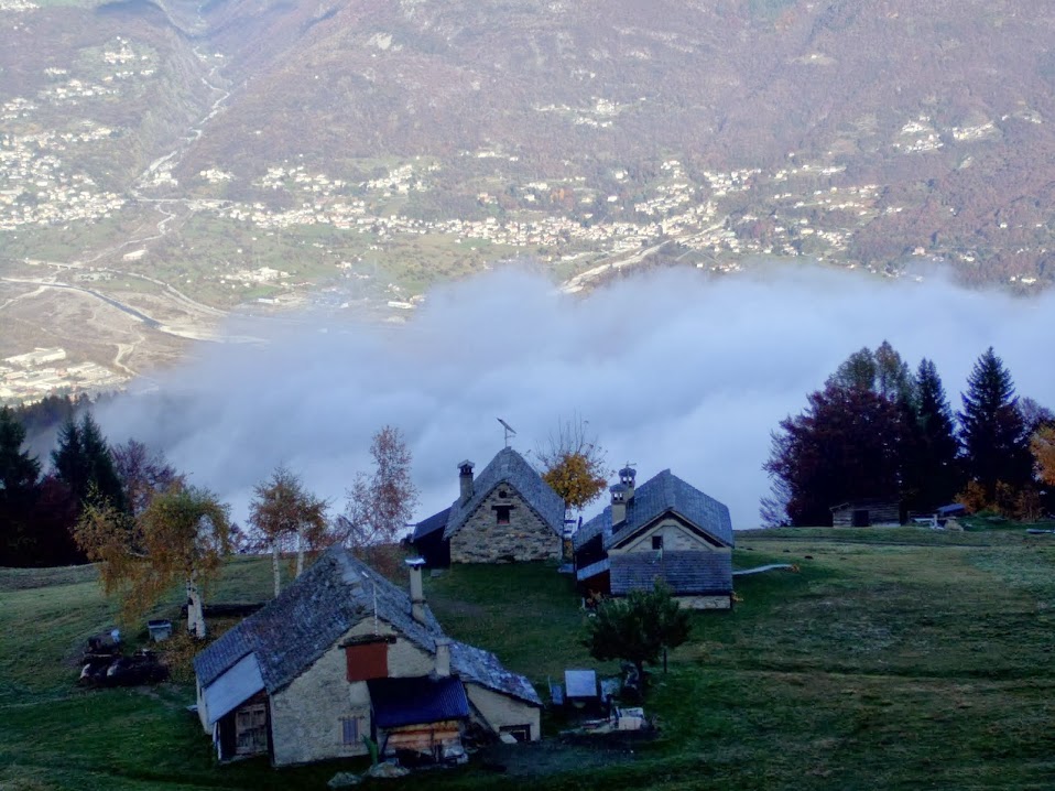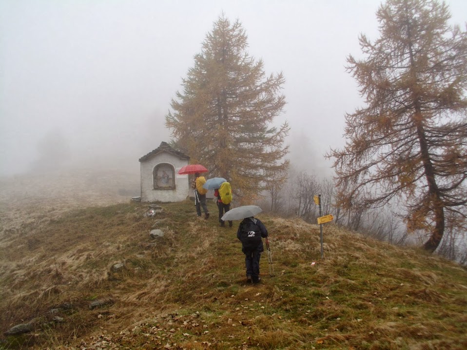 L'infallibile o quasi Meteosuisse dice che giovedì 31 ottobre 2013 “nella tarda mattinata” tornerà a splendere il sole. Convinco gli amici a tentare il Camughera, vetta per alcuni di noi sconosciuta. Ci troviamo a Foppiano, poco sopra l'Alpe Lusentino, 1249, in otto con la ex cucciola Asia. Piove, ma lo sapevamo. C'è anche nebbia, ma giochiamo in casa e questa montagna per noi non ha segreti. Seguiamo la strada, con gli ombrelli comodamente aperti, e raggiungiamo l'Alpe Torcelli, 1442. Un altro breve tratto e siamo all'Alpe Casalavera, 1594. E piove.