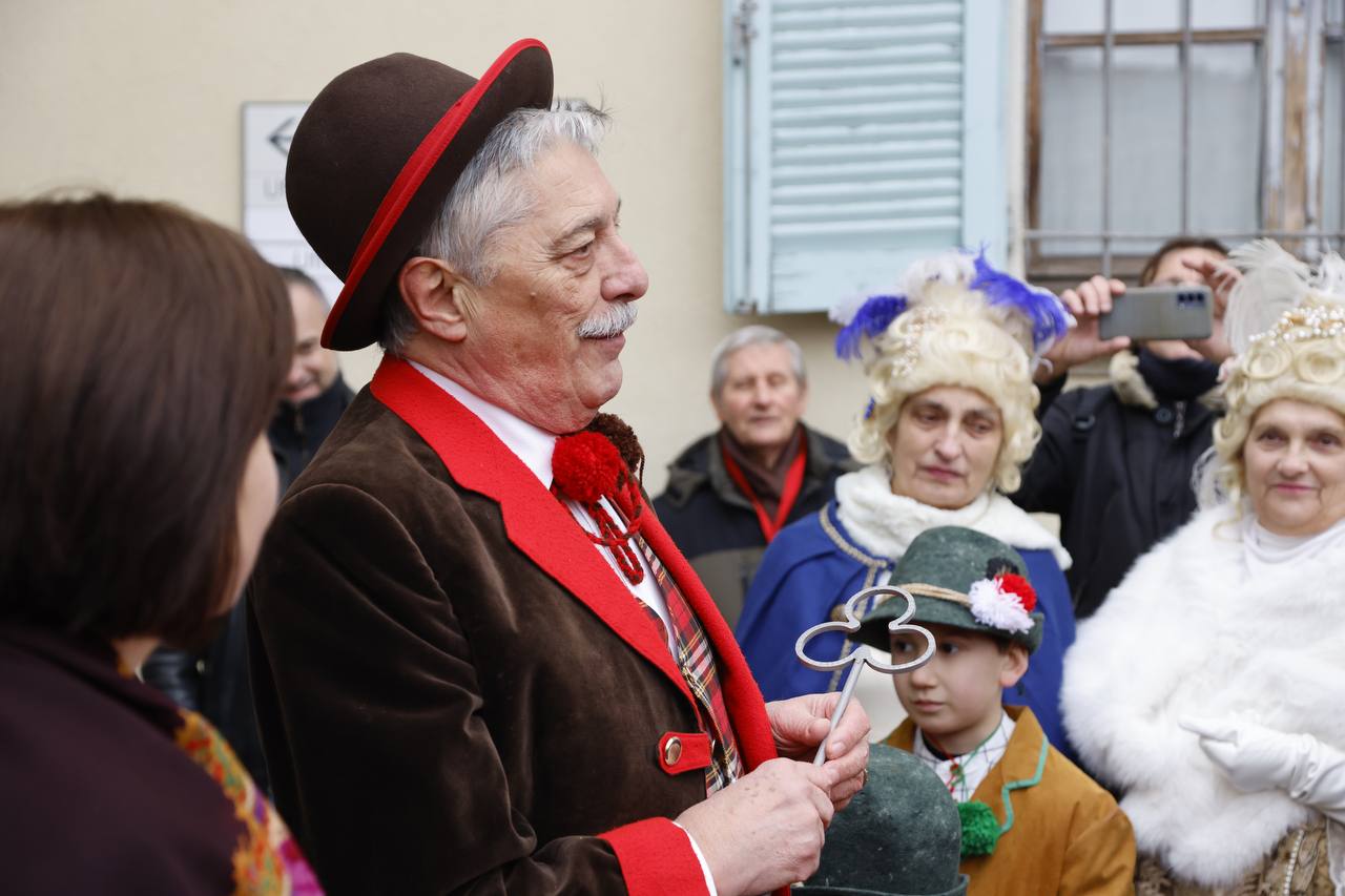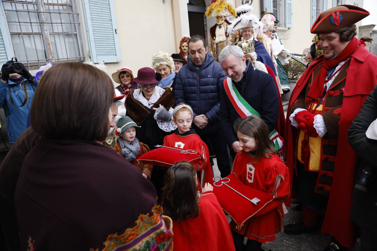 OLEGGIO - 16-02-2025 -- Si è aperta ufficialmente la 73^ edizione del Carnevale Oleggese. Domenica mattina, 16 febbraio, infatti, si è tenuta la tradizionale cerimonia di consegna delle chiavi della città da parte del sindaco Andrea Baldassini al Pirin, la maschera oleggese. A seguire lo stesso Pirin ha tenuto il discorso in forma bonariamente satirica dalla prèia dal pes.
