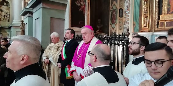 NOVARA – 22-01-2020 – E’ il giorno di San Gaudenzio a Novara. L’amato patrono della città e suo primo vescovo oggi, 22 gennaio, viene celebrato con l’intenso e tradizionale programma. La giornata è iniziata con il ritrovo delle autorità, delle associazioni e della banda musicale alle 9.45, per prepararsi all’inizio della sfilata del Corteo Civico che alle 10 si è incamminato festoso per portare i fiori per il lampadario della Basilica di San Gaudenzio, gesto con cui si ricorda il miracolo del roseto fiorito in inverno in occasione dell’incontro tra san Gaudenzio e Sant’Ambrogio. Qui alle 10.30 si è tenuta la cerimonia del fiore e la solenne liturgia eucaristica, presieduta dal vescovo Franco Giulio Brambilla.