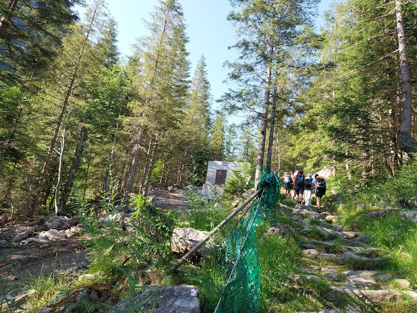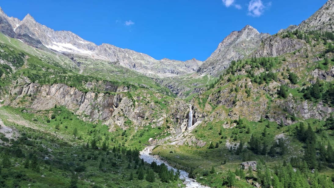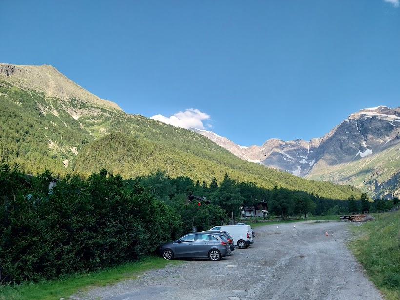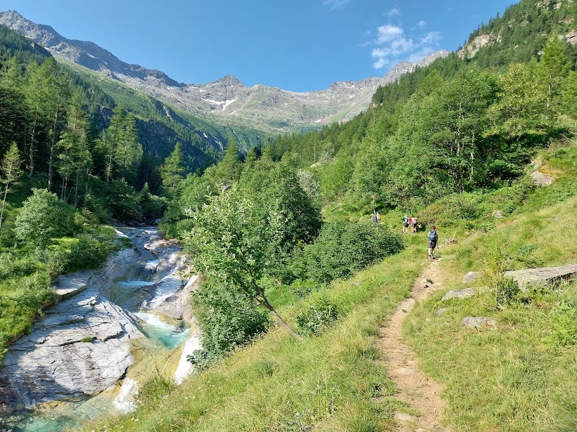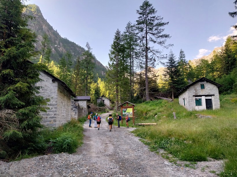 Con il mio cinquanta per cento di sangue macugnaghese che ribolle seguo gli amici nel tratto ancora pianeggiante fino all’Alpe La Piana, 1613. Da qui a quel che resta dell’Alpe Schena, 2005, il sentiero a tornanti ha pendenze ancora morbide, ma diventa più faticoso e sempre “infinito”, come tutta questa meravigliosa valle. Arriva anche il sole.