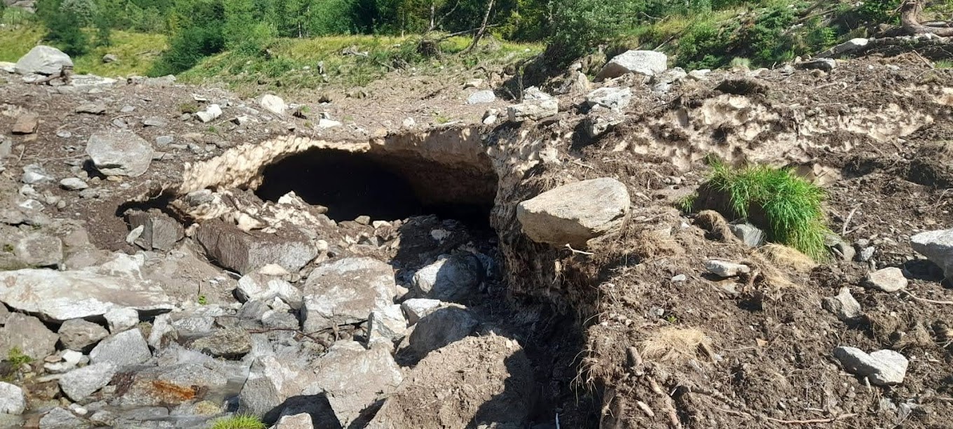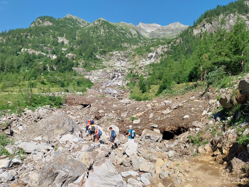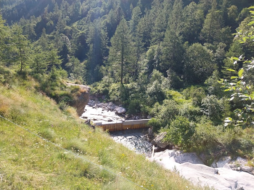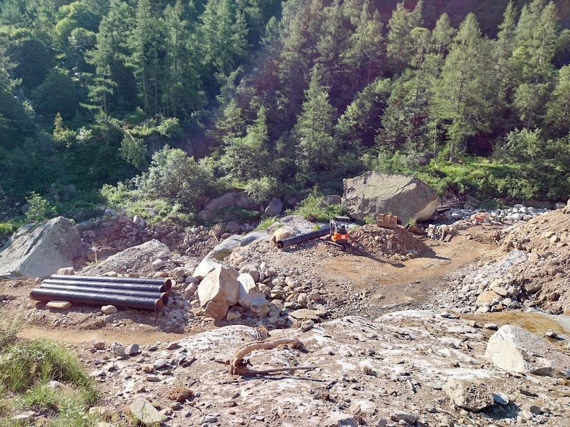 Entriamo nella valle, quasi pianeggiante fino a Crocette, 1360, la “Città Morta” della vecchia miniera d’oro (tre quarti d’ora). Il letto del torrente reca i segni pesanti dell’ultima grande “buzza”. Qui c’è un rifugio del CAI di Piedimulera e una sorgente d’acqua fresca che sgorga dalla punta di una piccozza. Ci sono lavori in corso poco oltre. Il mio atroce sospetto si materializza: stanno costruendo una grossa centralina idroelettrica.