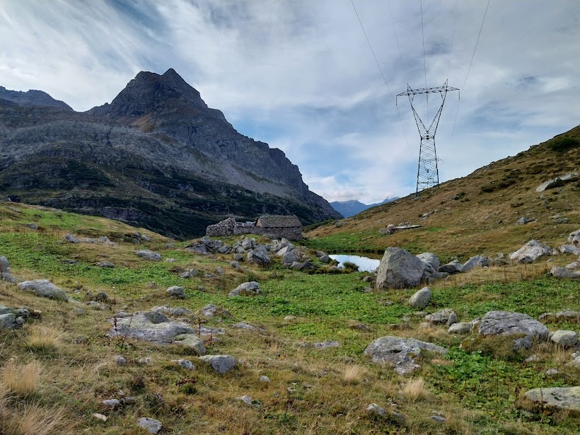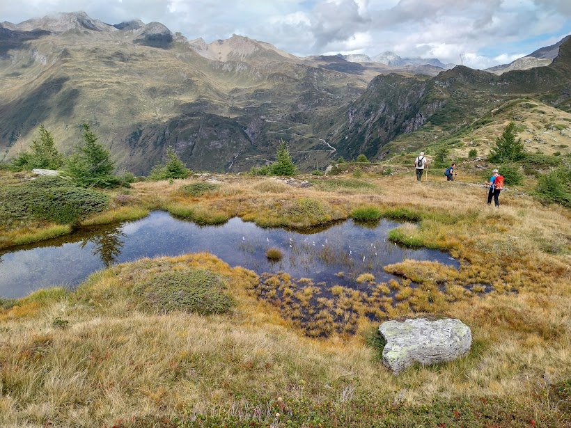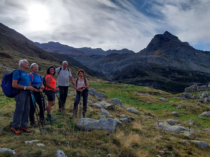 Oggi, per evitare partenze troppo veloci di cui risento solo io, gli amici mi mettono in testa al gruppo a fare il passo, da vecchio saggio o da “vaca vegia” a seconda dei punti di vista.  Ci dirigiamo a nord, in dolcissima salita fino a Frua di Sopra. Qui, al bivio per l’Alpe Ghighel, inizia il sentiero G22a che fa parte del TB (Tour del Basodino). E’ evidente, diretto a oriente, destra, e il pendio diventa subito impegnativo. Nonostante il passo del vecchio, dopo un’ora siamo all’Alpe, 2125. Proseguiamo in direzione sud est, inizialmente in salita fino a congiungerci con il sentiero G22 proveniente dal Lago Castel, poi in piano fino al guado del Rio Scelp, a quota 2200 circa.